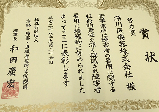 大変名誉なものとなりました。今後も微力ながら障がい者雇用を推進し、社会に貢献して参ります。