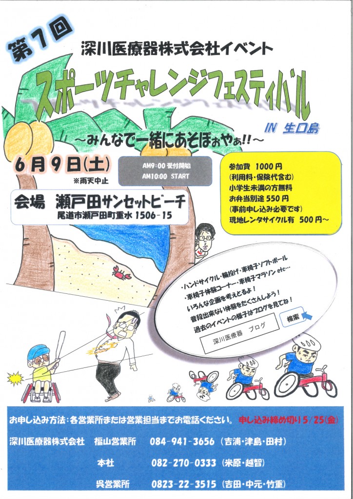 決定しました 第7回深川医療器イベント開催決定! 2018.04.09 毎年たくさんのユーザー様にお越しいただいておりますハンドサイクルイベントが、名前も新たに「スポーツチャレンジフェスティバル」として 6/9(土)開催決定!! たくさんのご参加をお待ちしております!!! Tweet Share Hatena Pocket RSS feedly Pin it 近澤製紙さん紙おむつ研修にいってきました 前の記事 ハッピーリモデル祭り inTDY広島ショールーム 次の記事
